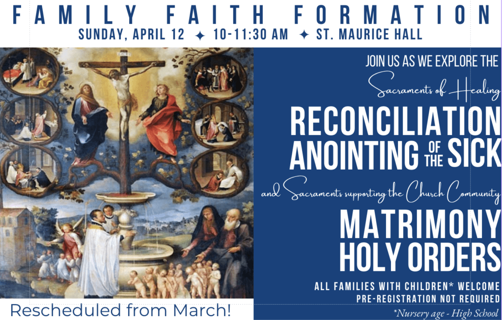 Our Family Faith Formation year is underway! Classes meet once a month on a Sunday morning at St. Maurice, from 10:00-11:30 am. Students in a sacrament year (First Communion and Confirmation) will have an additional class each month. For more information and to sign up, contact our Faith Formation Coordinator, Katie King, at katie@stfranciscatholic.org.