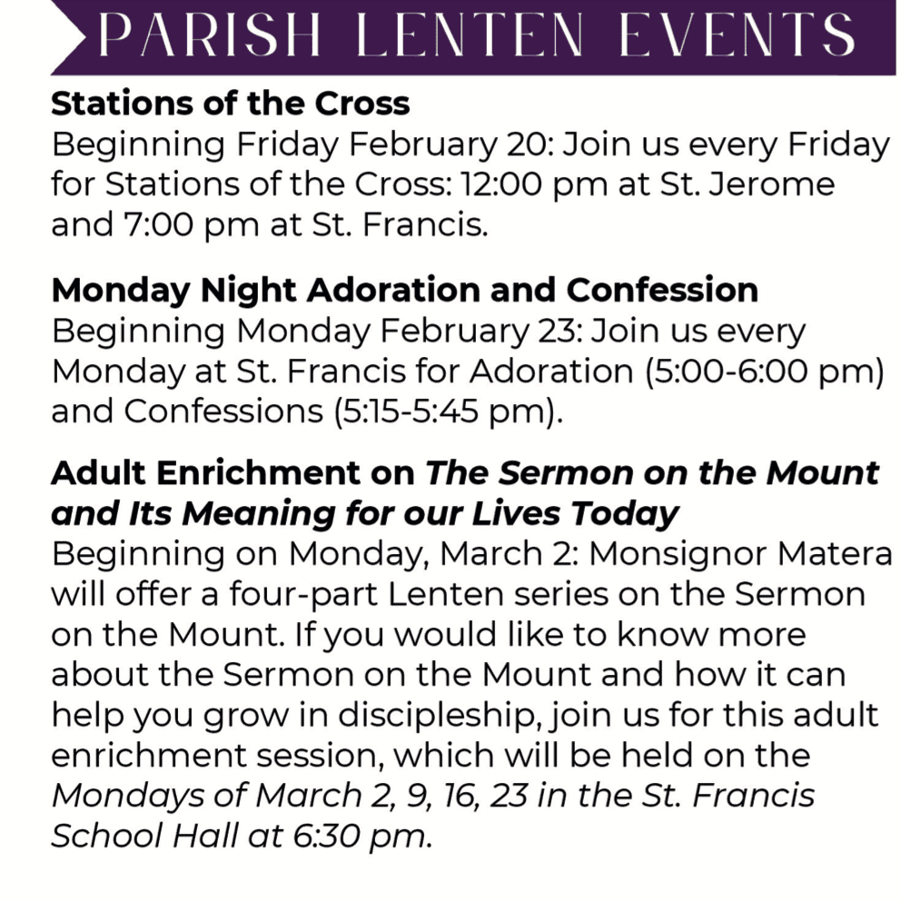 Latest News & Events Home / Latest News & Events Ash Wednesday Schedule & Lenten Events Sunday Mass Notice Update: The 10:30am Mass will continue to be held at St. Jerome through Easter Sunday, April 5th.